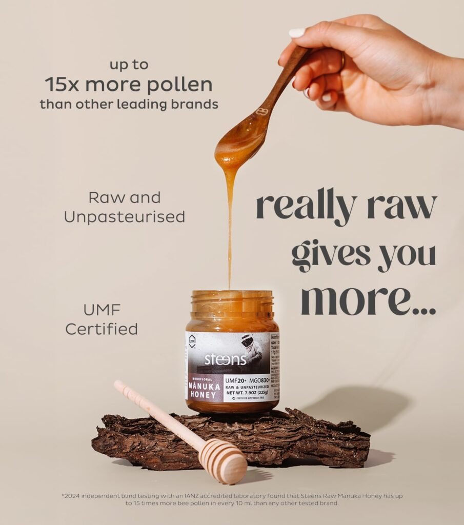 Steens sources its honey directly from New Zealand beekeepers and ensures the product is raw, unpasteurised, and authentic UMF-certified, which means the honey has been tested and verified for quality and potency.